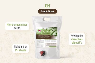 Les micro-organismes efficaces (EM) sont un mélange de bactéries actives qui favorisent ou augmentent l'équilibre naturel et la biodiversité dans l'élevage mais aussi favorisent le métabolisme de la digestion et nourrissent le microbiote intestinal.
