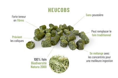 Bouchon de foin sans mélasse HeuCobs pour chevaux. 100% Foin. Simplement de l'herbe des prairies Baltes sous convention Natura 2000*, compressé en granulé de 14mm. Aliment complémentaire parfaitement adapté aux chevaux, poneys et autres animaux herbivores.